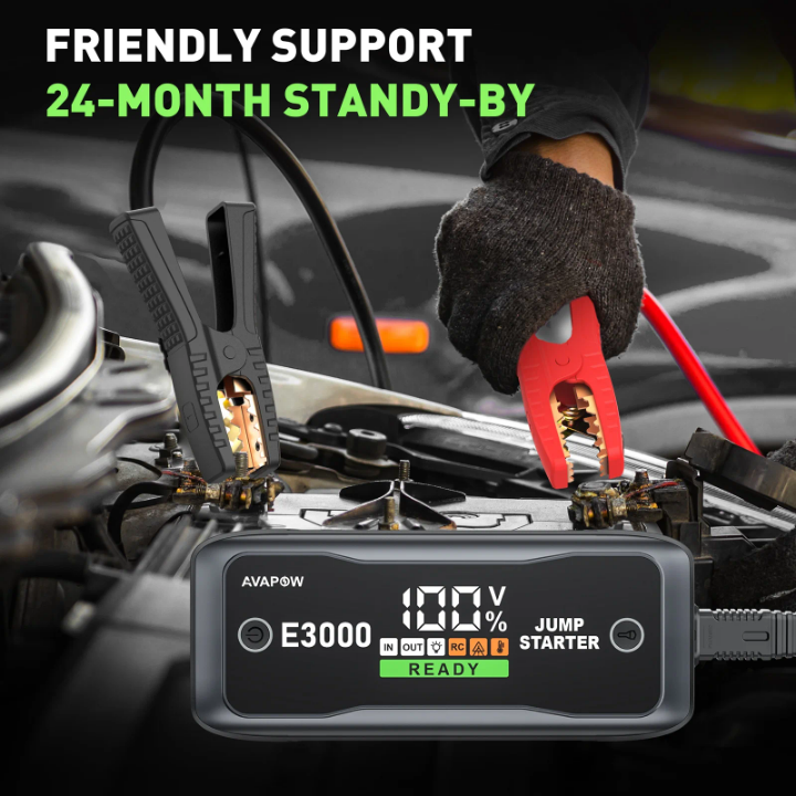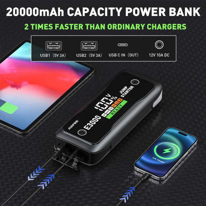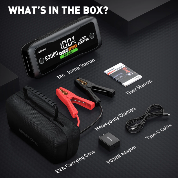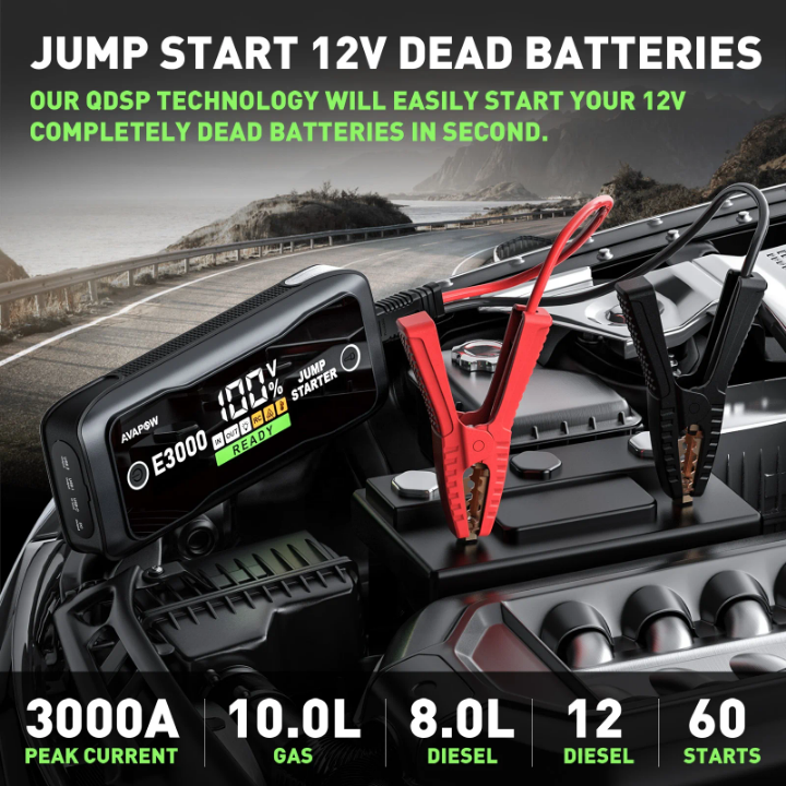 • ⚡ قوة تشغيل جبارة (3000A): بفضل تياره الأقصى البالغ 3000 أمبير، يمكنه تشغيل معظم محركات البنزين والديزل، بما في ذلك سيارات الدفع الرباعي، الشاحنات الخفيفة، والقوارب (كما هو موضح على الصندوق: 10.0 لتر بنزين و 10.0 لتر ديزل).