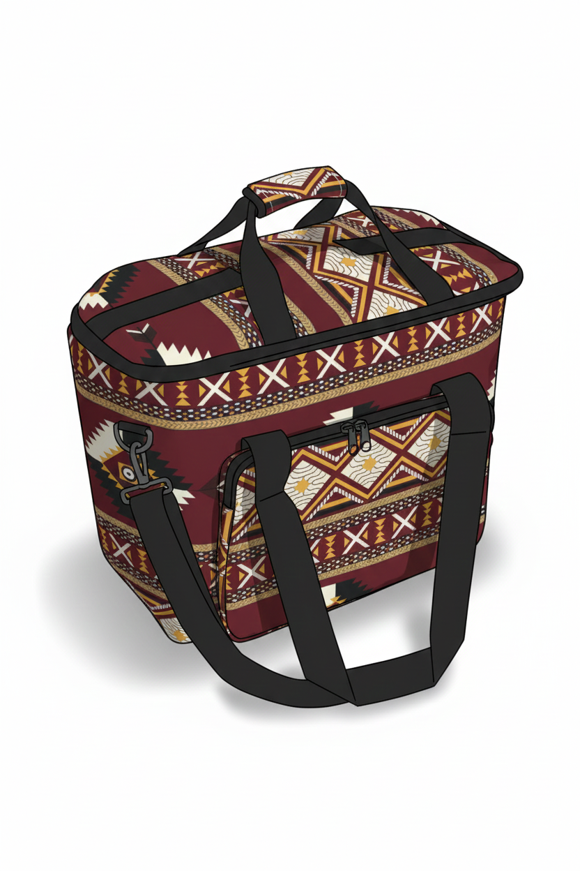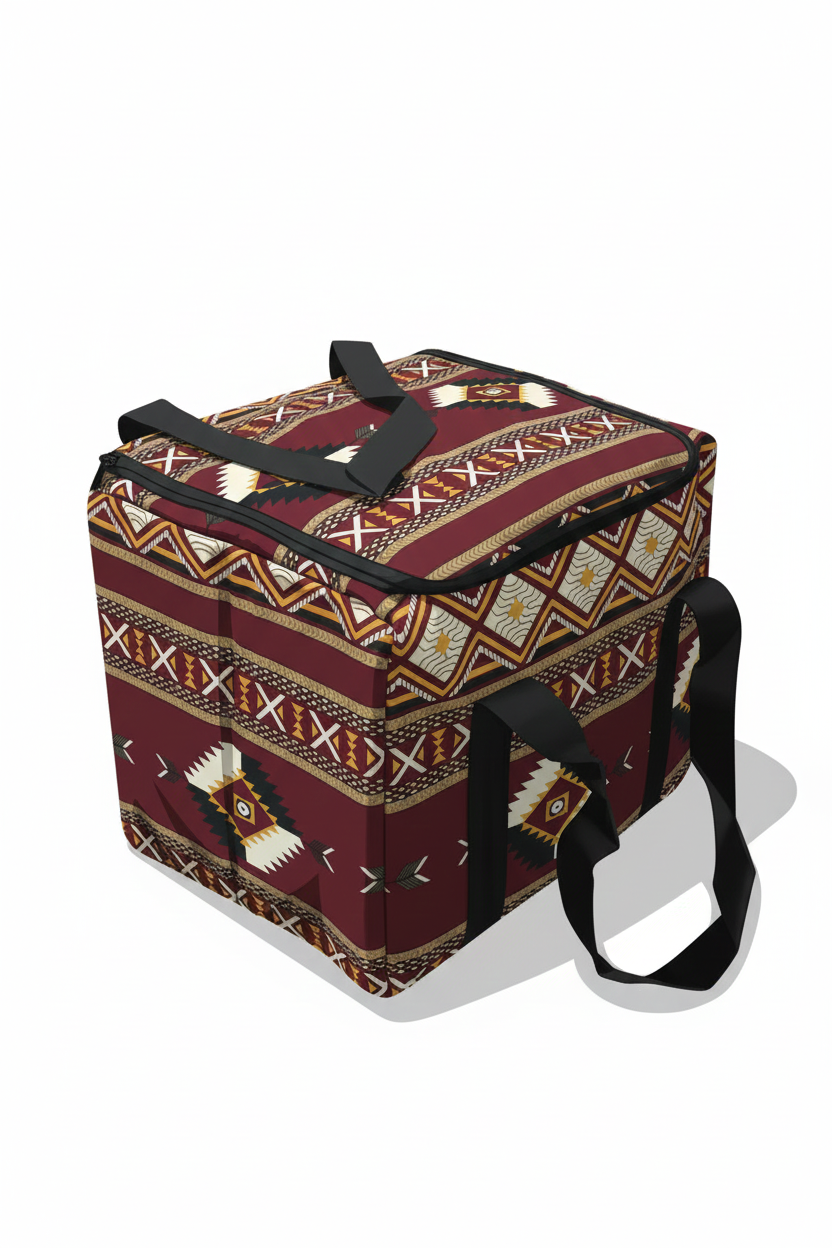 حقيبة عزل حراري ضخمة بتصميم صندوقي، تتميز بنقوش عرقية جذابة تضيف لمسة جمالية أصيلة لرحلاتك وتجمعاتك الخارجية. مبطنة بطبقة عازلة سميكة للحفاظ على الأطعمة والمشروبات باردة أو ساخنة لساعات، وهي مثالية لحمل كميات كبيرة من لوازم النزهات أو التسوق. مزودة بمقابض يد قوية وحزام كتف لسهولة الحمل، وتصميمها القابل للطي يسهل تخزينها.